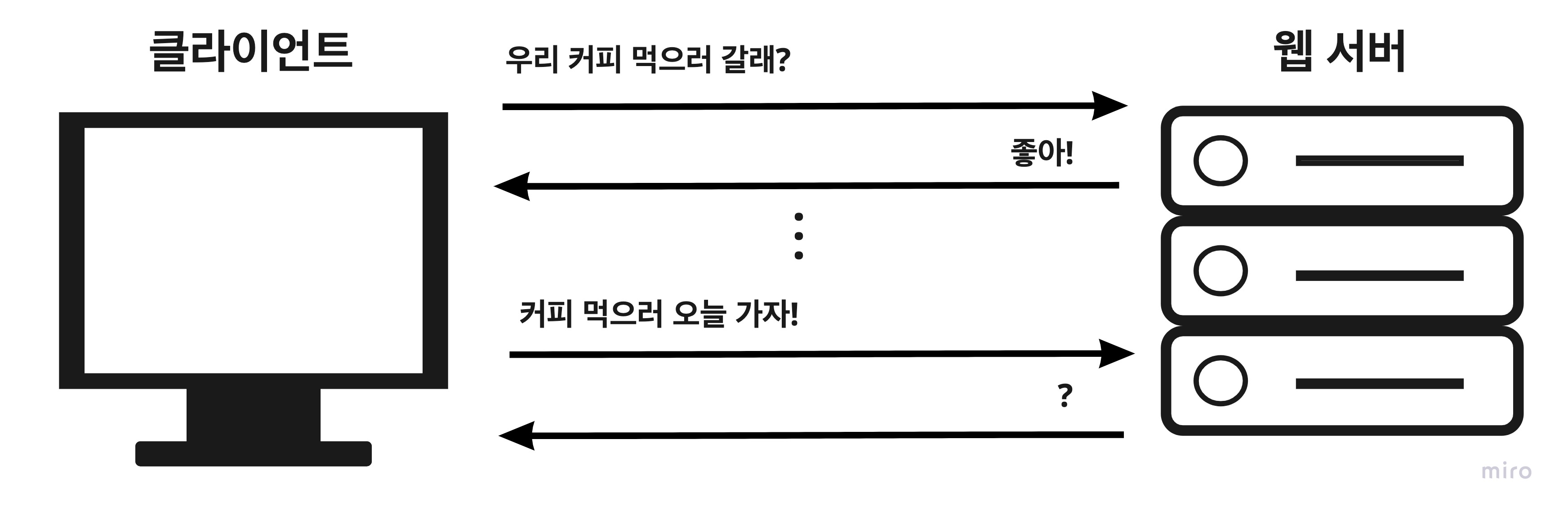 예를 들어 이 그림처럼 클라이언트가 커피먹으러 가자고 서버에게 요청해서 "좋아!" 라는 응답을 잘 받아왔지만 그 다음번에 "커피 먹으러 오늘 가자!"라고 요청을 한다면 서버는 이 전에 "커피 먹으러 갈래?" 라는 요청을 기억하지 못하기 때문에 클라이언트가 원하는 응답을 줄 수가 없게 되는 것입니다.