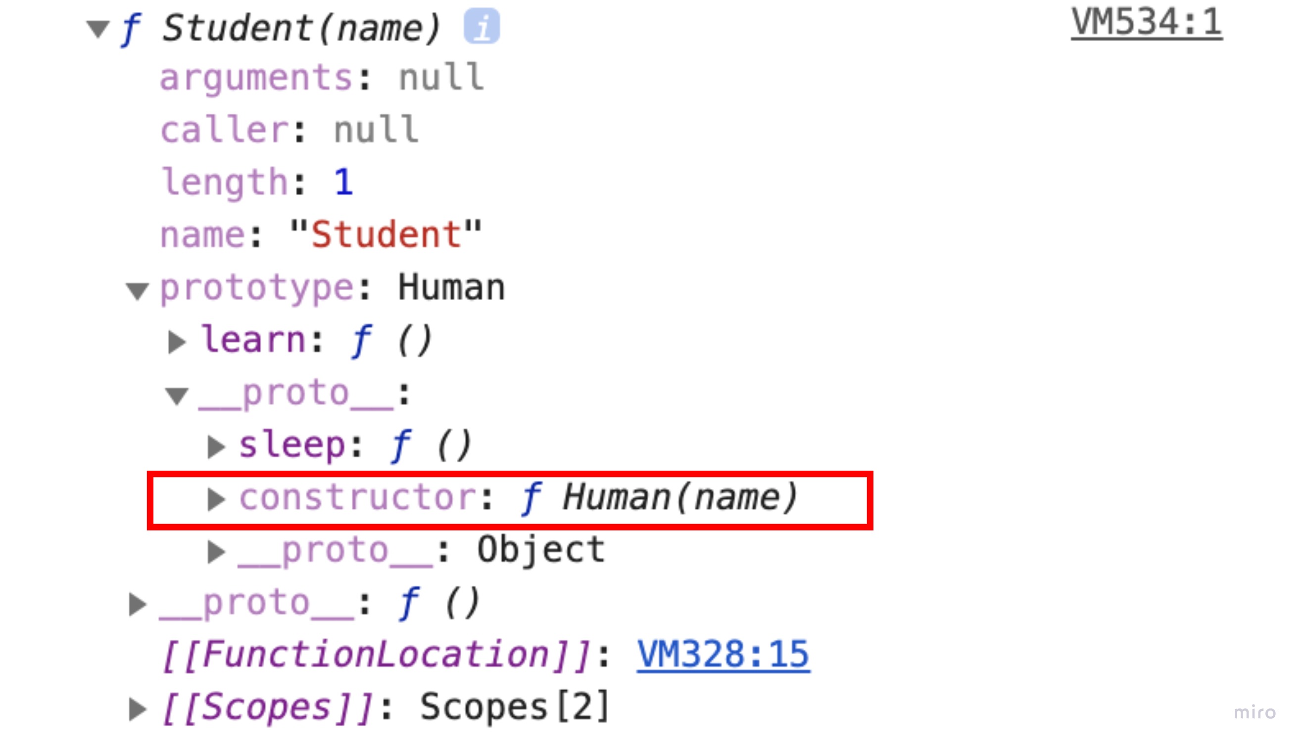 Human에 속한 프로토타입을 보면 sleep 메서드와 constructor: ƒ Human(name)을 확인할 수 있고